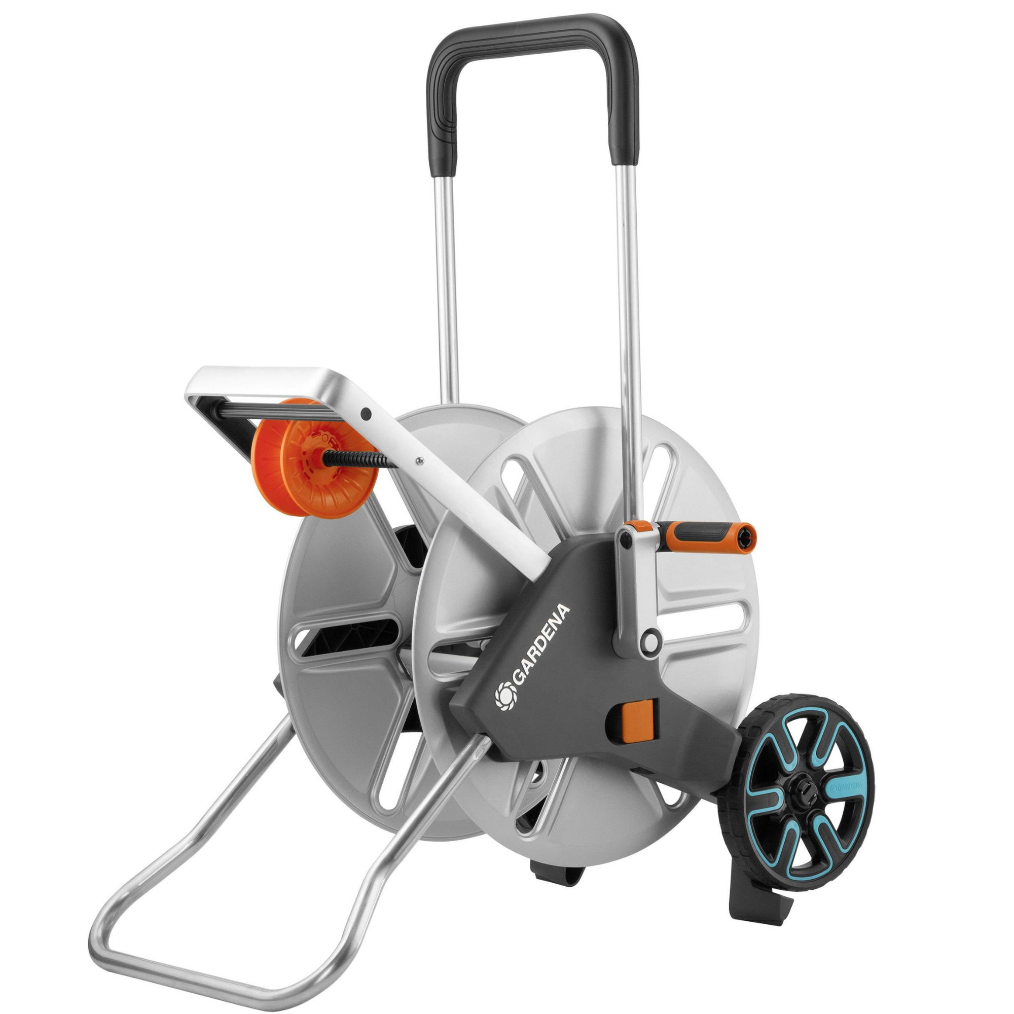 The hose guide, in the sturdy metal frame above the reel, ensures that the hose is evenly rolled up without guiding it by hand. This is done using only the crank on the hose reel.